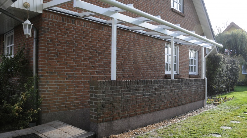 Dach und Stützen aus Alu, zahlreiche Dachformen wie Pult-, Walm-, Satteldach, Dacheindeckung wahlweise Kunststoff-Stegplatte oder VSG 10mm, Standardfarbe RAL 9016 weiß, seidenmatt, alternativ jeder RAL-Ton, auch in feinstruktur, lieferbar. Einbau von Fensterelementen oder Glasschiebetüren mit oder ohne Rahmen, auch nachträglich, möglich.