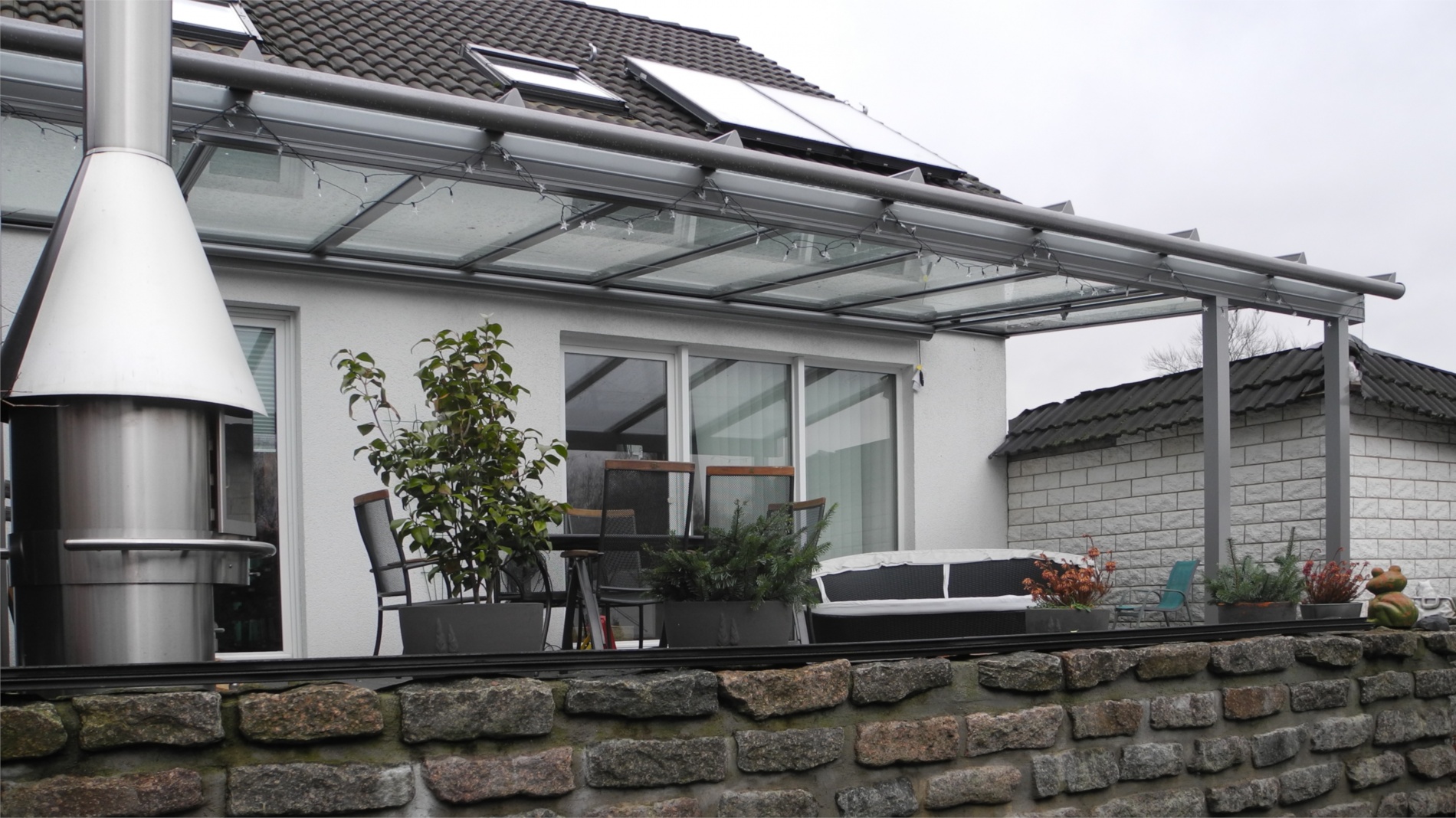 Dach und Stützen aus Alu, zahlreiche Dachformen wie Pult-, Walm-, Satteldach, Dacheindeckung wahlweise Kunststoff-Stegplatte oder VSG 10mm, Standardfarbe RAL 9016 weiß, seidenmatt, alternativ jeder RAL-Ton, auch in feinstruktur, lieferbar. Einbau von Fensterelementen oder Glasschiebetüren mit oder ohne Rahmen, auch nachträglich, möglich.