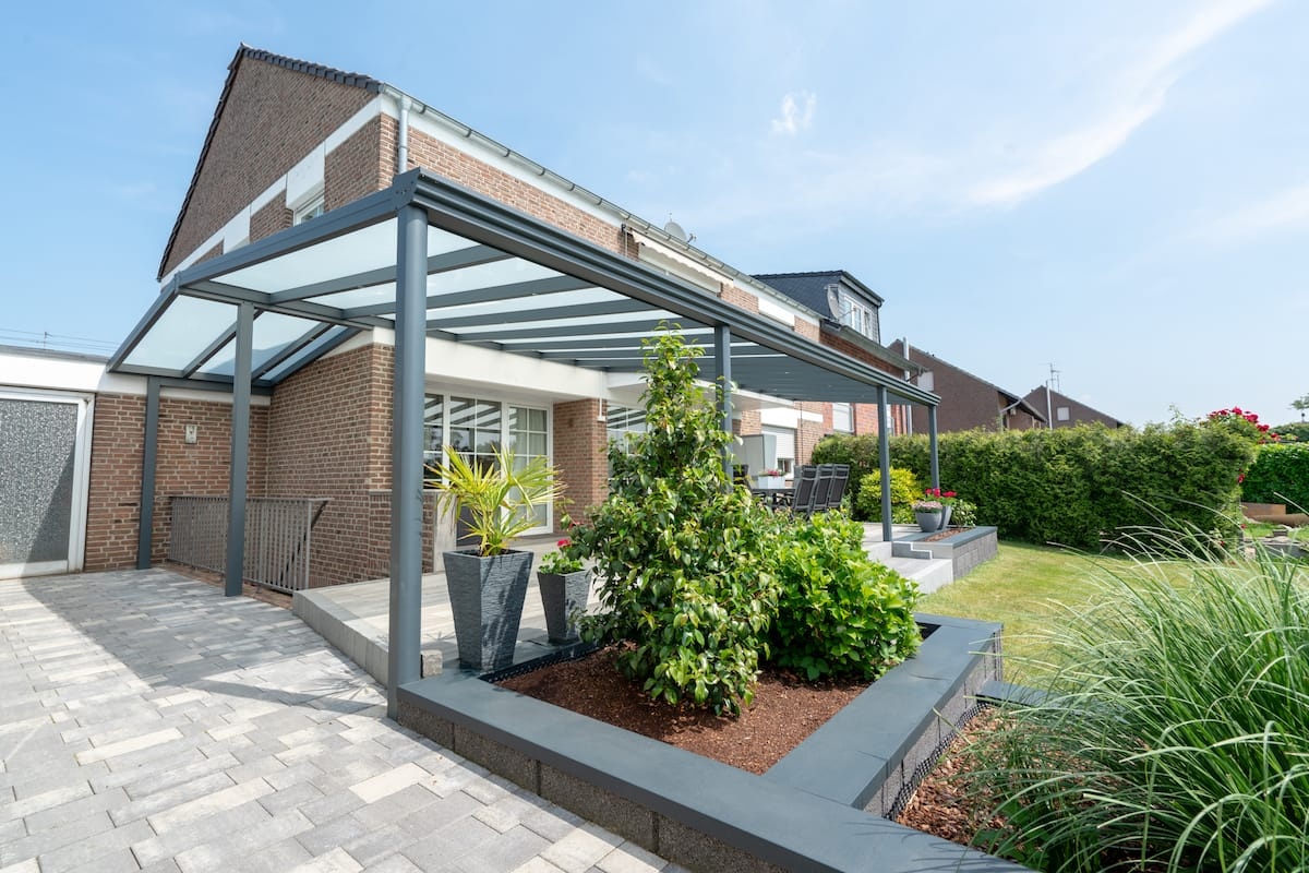 Dach und Stützen aus Alu, untenliegende Dachstatik, Dachdeckung Polycarbonat-Stegplatte, Standardfarben RAL 9016, 7016..., wahlweise Fensterelemente, Schiebetüren mit oder ohne Rahmen, LED-Beleuchtung, auch später nachrüstbar.