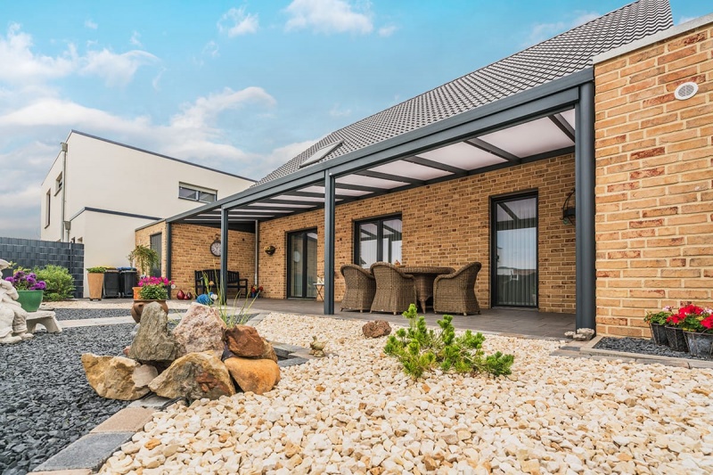 Dach und Stützen aus Alu, untenliegende Dachstatik, Dachdeckung Polycarbonat-Stegplatte, Standardfarben RAL 9016, 7016..., wahlweise Fensterelemente, Schiebetüren mit oder ohne Rahmen, LED-Beleuchtung, auch später nachrüstbar.