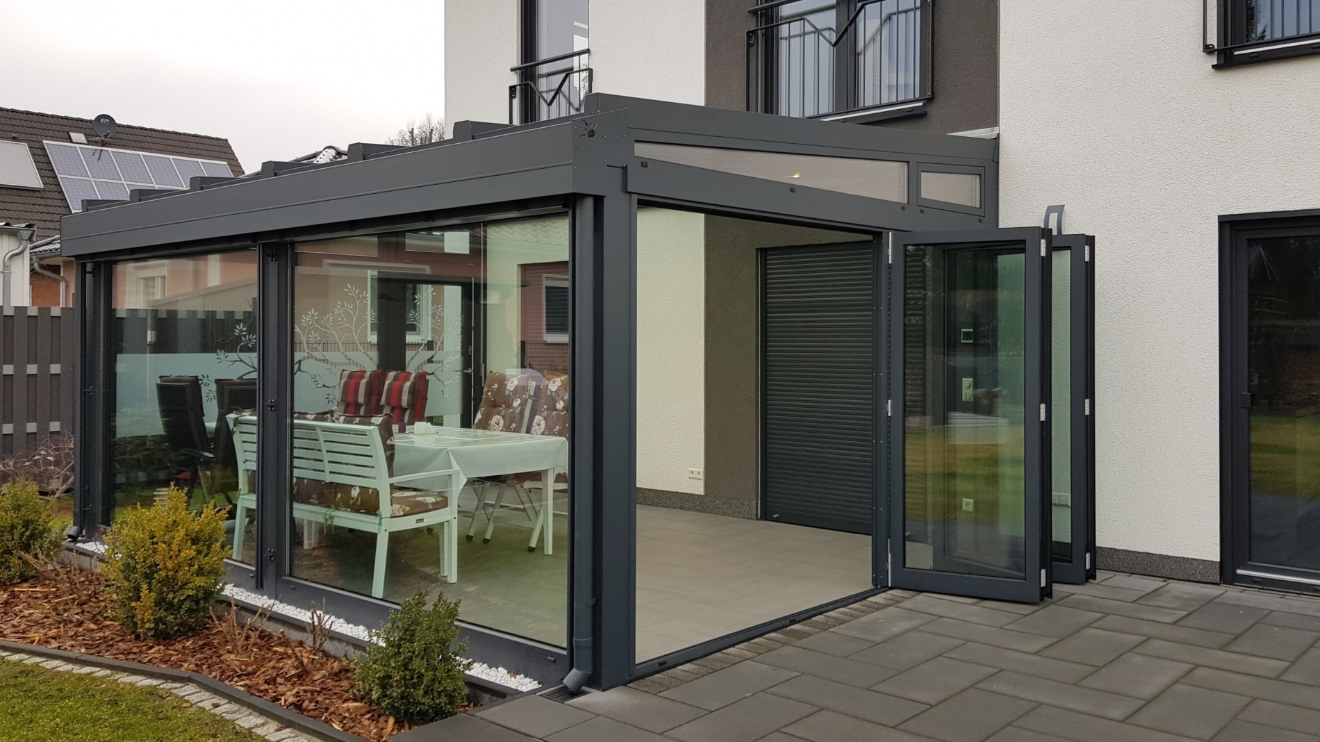 Dach und Stützen Alu, Fenster Kunststoff. Extras: Dach in Sonderfarbe, Fenster farbig foliert, Alu-Falttüren, Front mit integrierten Jalousien, Haustür mit Stoßgriff außen und Drücker innen, flache Schwellen, LED-Beleuchtung, Übergroße Front- und Seitenverglasung, Dreifachverglasung...