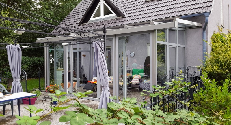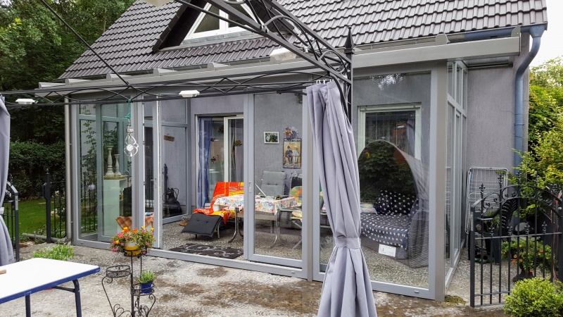 Dach und Stützen Alu, Fenster Kunststoff. Extras: Dach in Sonderfarbe, Fenster in Sonderfarbe foliert, Dach mit Sonnenschutzverglasung, Front mit Parallel-Schiebe-Kipp-Türen, Seiten mit Dachüberstand, besonders hohe Frontfensterbehind it.