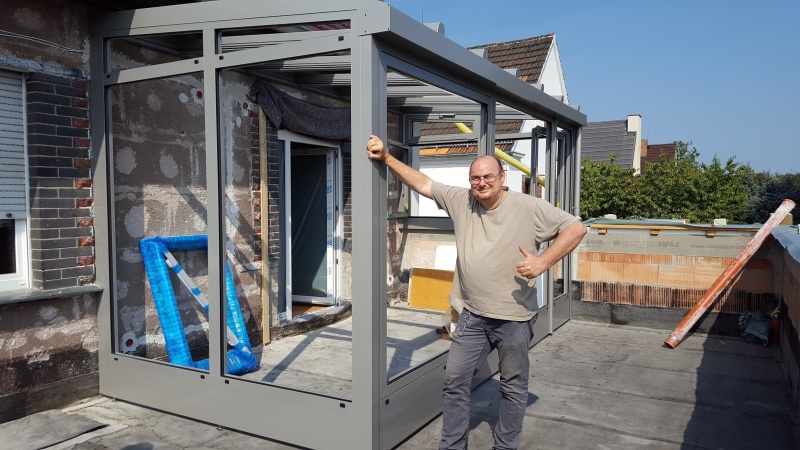 Fam. R. in Berlin-Biesdorf. Dach und Stützen Alu, Fenster Alu. Extras: Dach in Sonderfarbe, Dach mit Schiebelüfter, elektrisch, Fenster in Sonderfarbe, Dach mit Sonnenschutzverglasung, Front mit Parallel-Schiebe-Kipp-Tür, Dachmarkise.